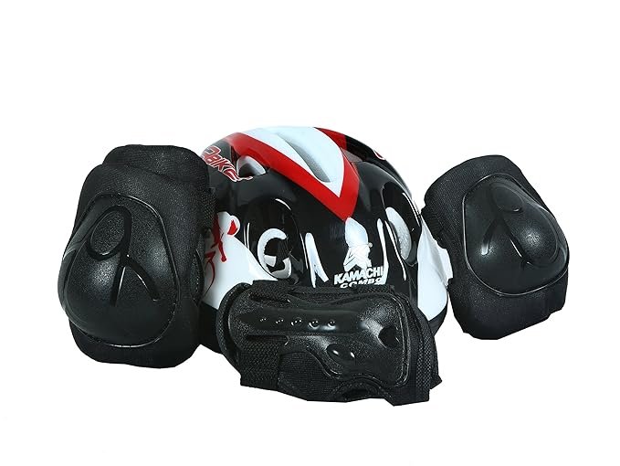 The Kamachi PE44 combo includes a durable helmet, elbow guards, knee guards, and hand gloves, offering full-body protection for common impact areas. The helmet features an adjustable fit design, making it suitable for different head sizes. It comes with a secure buckle strap that ensures the helmet stays firmly in place during movement. The adjustable straps allow easy customization for a snug and comfortable fit.